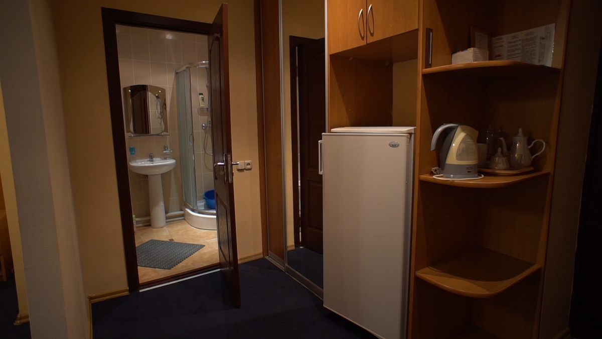 В номере: односпальная кровать, прикроватная тумба, стол, стулья, шкаф, кресло, телевизор, холодильник, электрочайник, утюг с гладильной доской, сушилка для белья, набор посуды