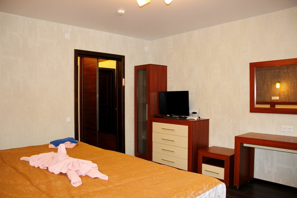 В номере: двуспальная кровать, прикроватные тумбы, стол, стулья, шкаф, тахта, телевизор, холодильник, электрочайник, утюг с гладильной доской, сушилка для белья, набор посуды
