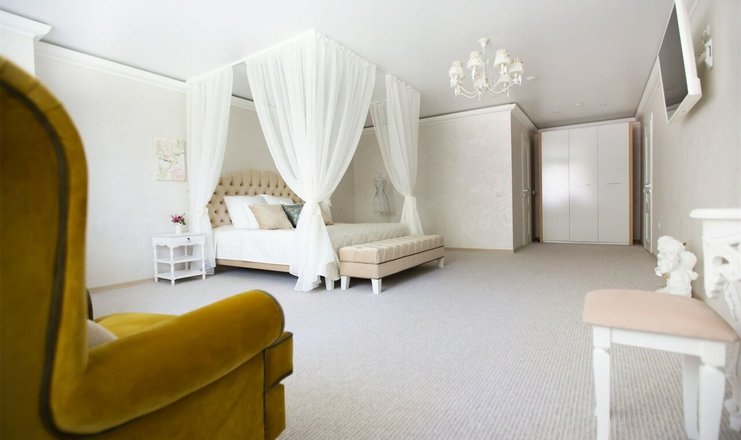 В номере: вешалка, зеркало, кресла, кровать двуспальная, прикроватные тумбочки, столик журнальный, столик туалетный, шкаф, мини-холодильник, телевизор ЖК, телефон, чайный набор посуды, электрочайник