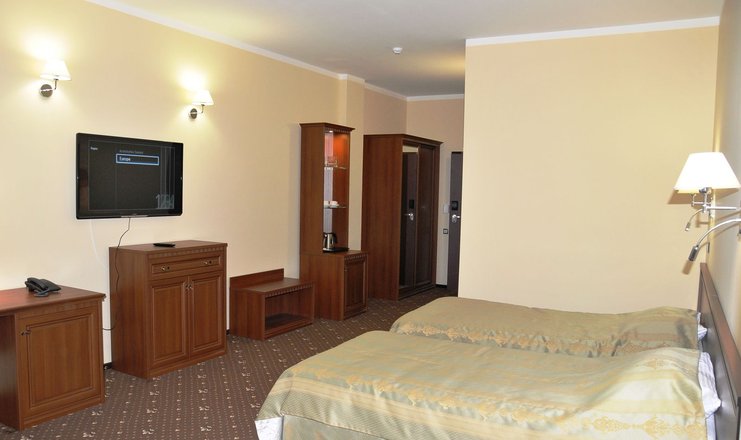В номере: две удобные отдельные кровати, две тумбочки, кресло-кровать, журнальный столик,два стула и сьменный стол, настольная лампа, шкаф с зеркалом, ЖК телевизор, телефон, стеллаж, мини-бар, электрический чайник, набор посуды,сейф, бесплатный wi-fi, кондиционер
