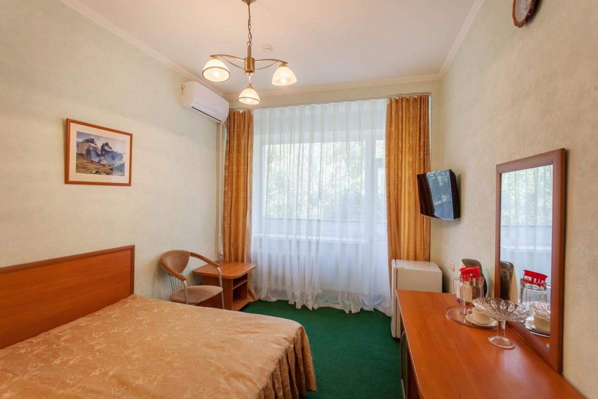 В номере: кровать, прикроватные тумбы, шкаф, стол, стулья, холодильник, спутниковое кабельное ТВ, электрочайник, набор посуды
