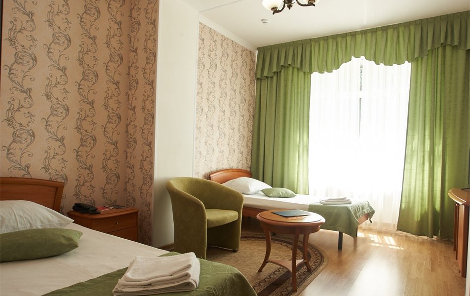 В номере: вешалка, зеркало, кресло, диван, кровати односпальные, двуспальная кровать, прикроватные тумбочки, стол, столик журнальный, шкаф, телевизор, телефон, холодильник, чайный набор посуды, электрочайник