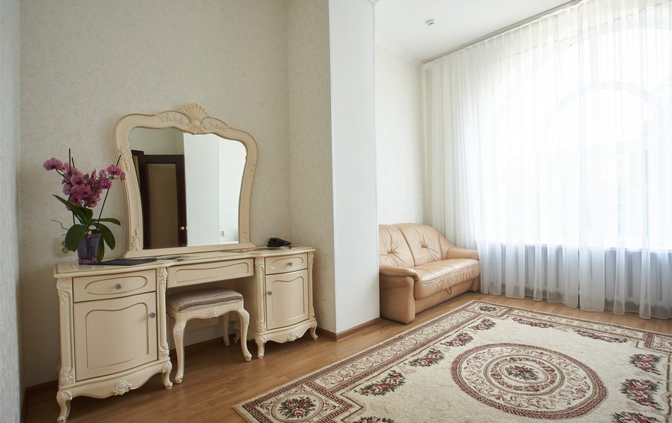 В номере: вешалка, зеркало, кресло, диван, кровати односпальные /одна двуспальная кровать, прикроватные тумбочки, стол, столик журнальный, шкаф, телевизор, телефон, холодильник, чайный набор посуды, электрочайник