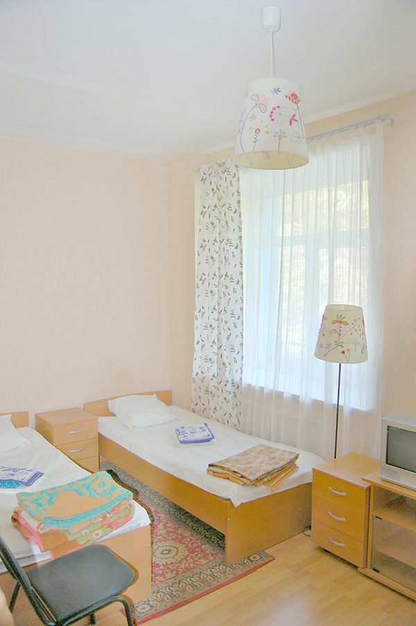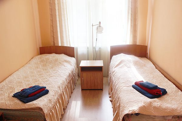 В номере: две односпальные кровати, прикроватные тумбочки, вешалка, зеркало, шкаф, телевизор, холодильник, чайный набор посуды