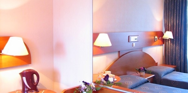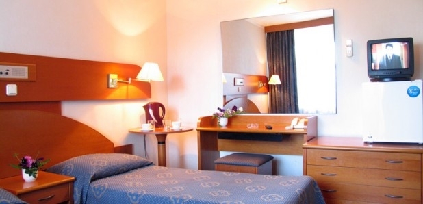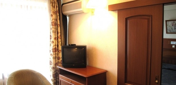 В номере: две 1,5-спальные кровати, тумбочки, бра, коврики, туалетный столик, два встроенных платяных шкафа, ТВ, кондиционер, радио, выход на балкон (летняя мебель).